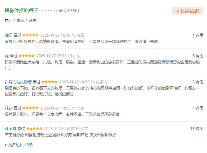11月27日,电视剧《暗影侦探》在爱奇艺一口气12集上线。资料平台上显示,这部电视剧总计是24集的内容。等于说,平台这边第一天便把剧作的半数内容上线了。一般这种上线模式的电视剧,都是平台这边不够重视的。该剧由王星越、吴佳怡两位青年演员主演。虽然平台不怎么重视,但这两位青年演员都是流量新秀。剧作上线之后,在豆瓣,已经形成了清一色的好评局面。