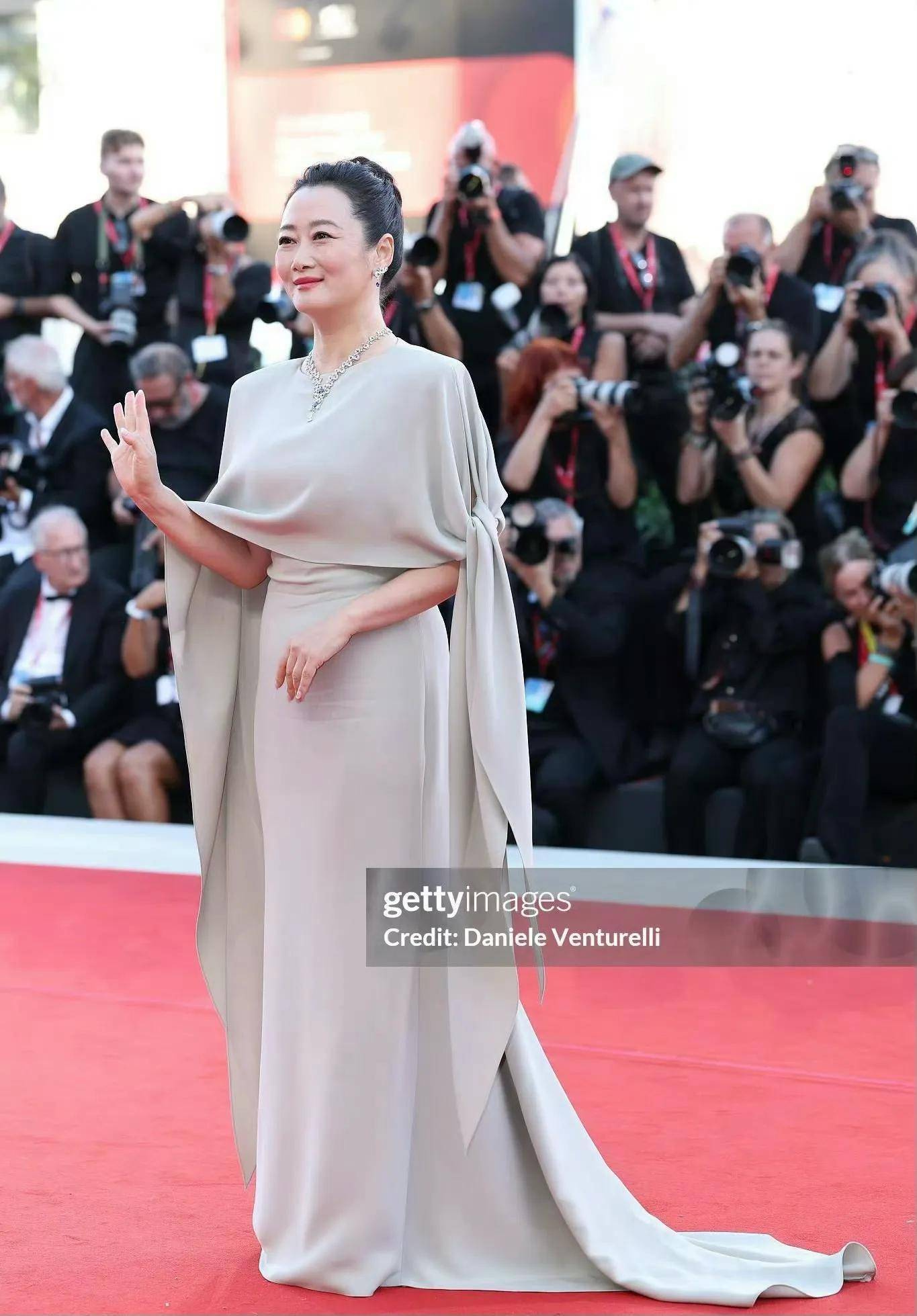 作为优秀的女演员,赵涛这次的穿搭也颇有女王风范!一袭银灰色缎面披肩长裙搭配高扎盘发造型,雍容华贵!
