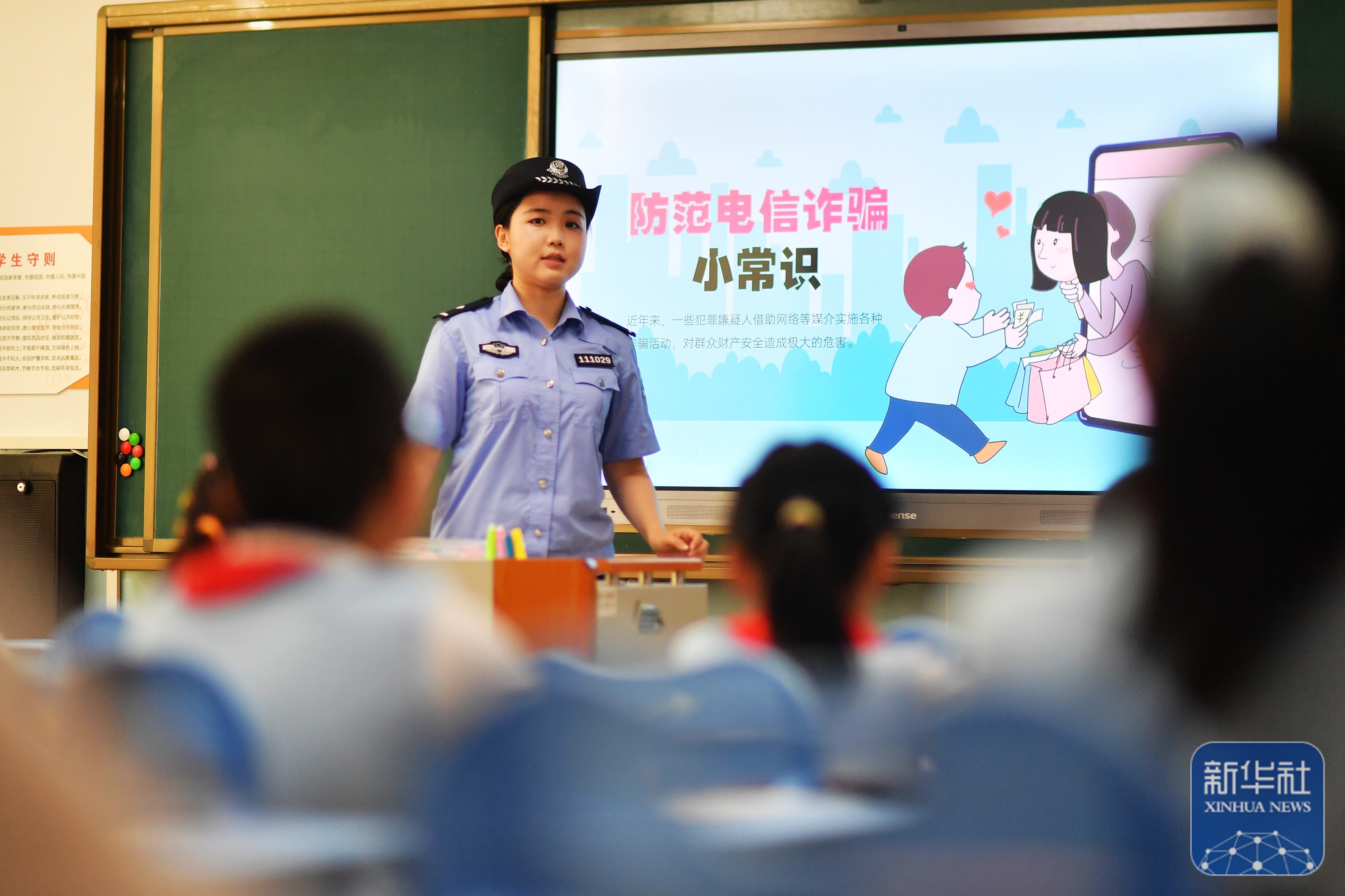9月15日,在山东省荣成市府新小学教室内,辖区民警通过案例讲解为学生们普及网络安全和防诈骗知识。新华社发(李信君摄)