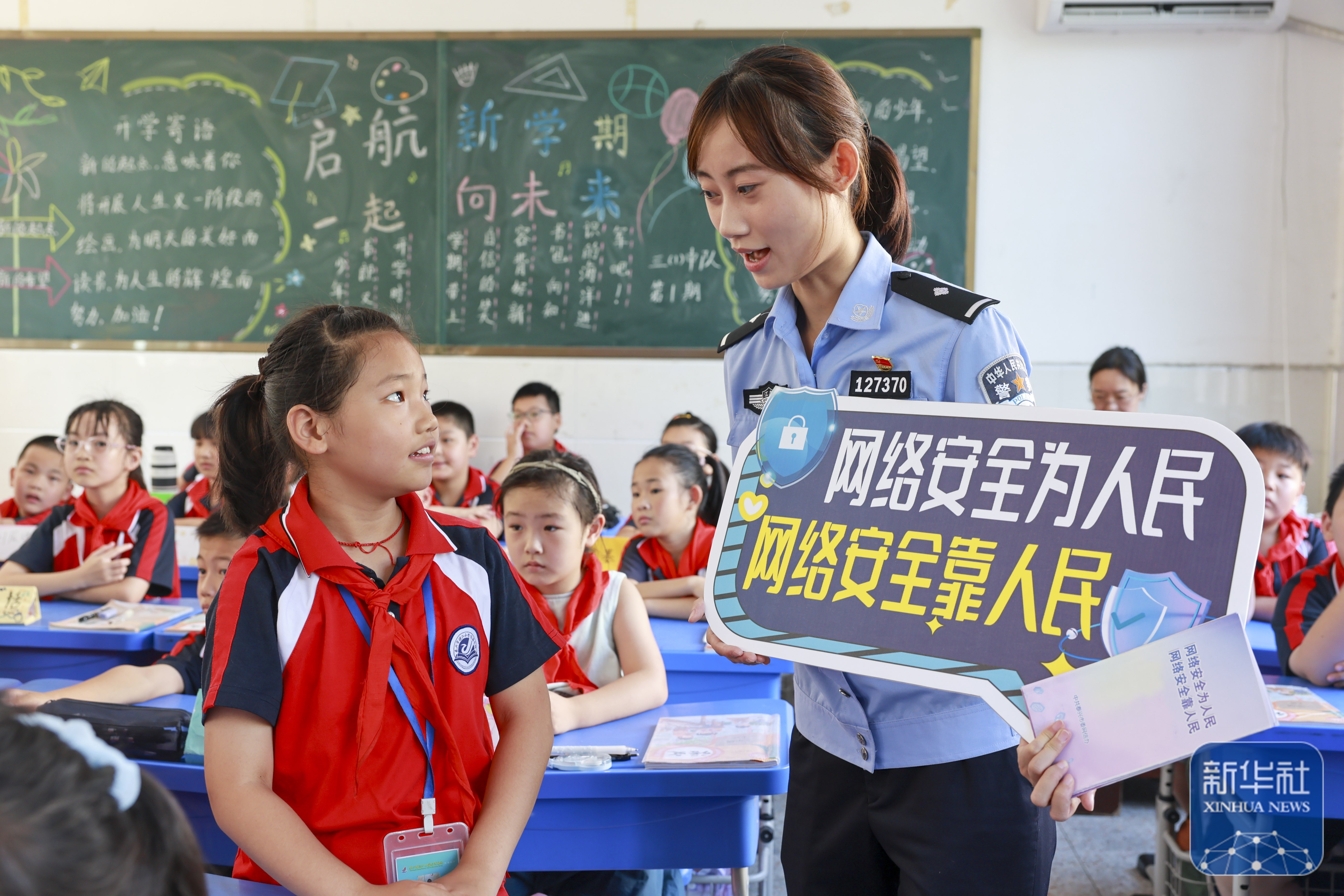 9月15日,民警在天津市滨海新区塘沽实验小学为学生讲解网络安全知识。新华社发(杜鹏辉摄)